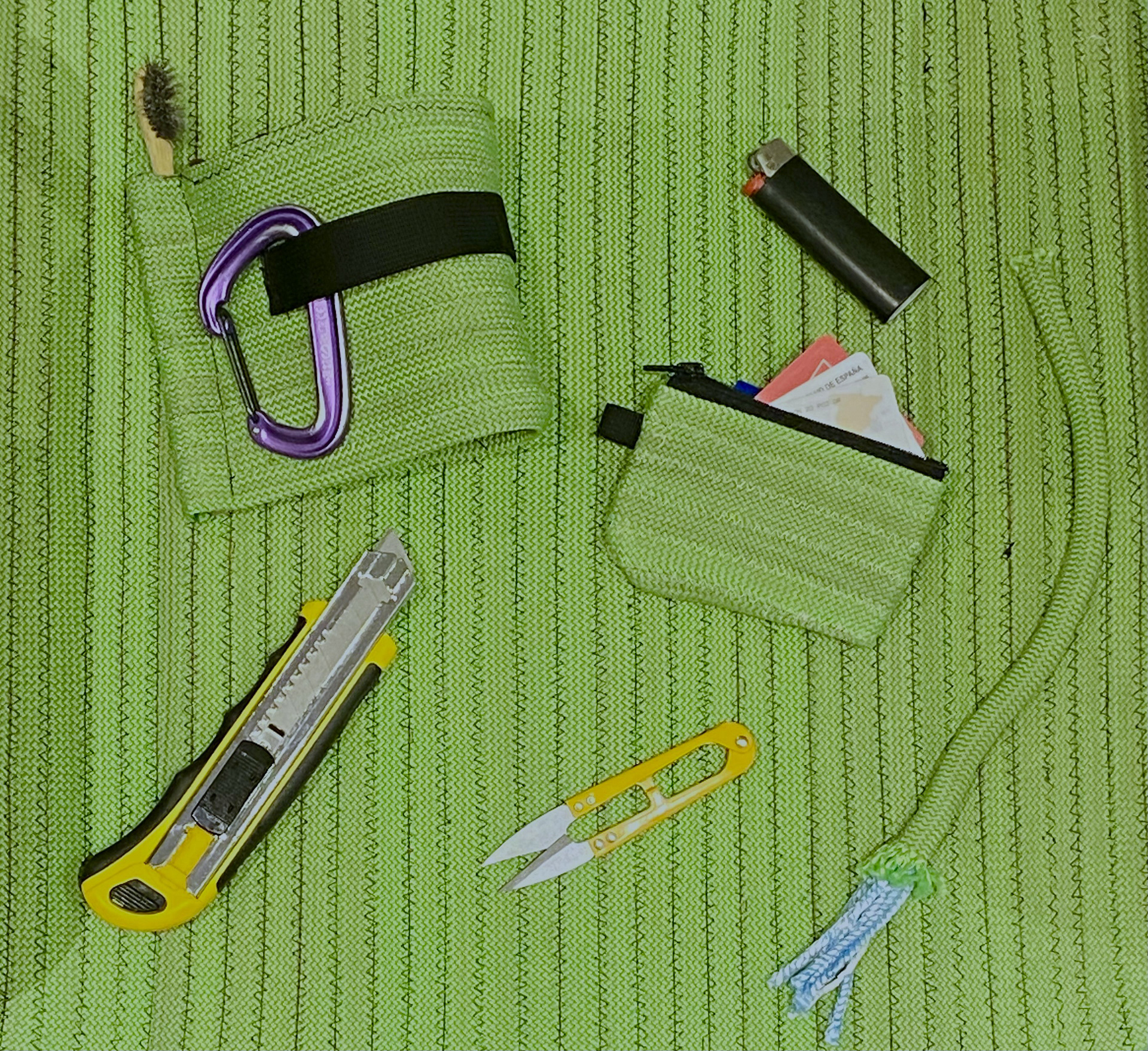 Regular climbers retire their ropes every 1–3 years, resulting in significant material waste. While no longer reliable for big falls, these ropes retain durable properties suitable for extended use. This project explores creative ways to give my retired climbing rope a second life, reducing its environmental impact through a series of products, including a reupholstered chair, a credit card wallet, and a climbing chalk bag.